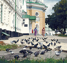27 июля 2009 года, 16:20Перед приездом патриарха голуби со всего Киева слетелись в Киево-Печерскую лавру