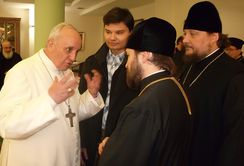 Со своей стороны митрополит Иларион представил членов делегации "и передал понтифику сердечные благопожелания от Святейшего патриарха Московского и всея Руси Кирилла".